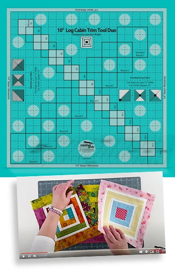 Welches Fertigmaß Sie dabei auswählen, bleibt Ihnen überlassen, denn beide Blockgrößen werden auf die gleiche Weise zugeschnitten und genäht. Nach jeder Runde „Baumstämme“ (Streifen) rund um die Wände Ihres Blockhauses legen Sie einfach das entsprechende Mittelquadrat auf den s.g. Schornstein Ihres Blockhausmusters und schneiden den überstehenden Stoff am Lineal entlang zurück. Da jede Runde begradigt wird, so dass ein perfektes Quadrat entsteht, bevor Sie die nächste Runde annähen, erhalten Sie präzise Ergebnisse – jedes Mal!
