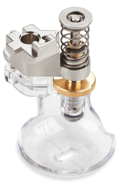 Der Verstellbare Gleitschalenfuss #74 ist geeignet zum Quilten über ungleichmässige Oberflächen wie Stickmuster, Applikationen oder dicke Nähte. Die transparente Sohle ermöglicht perfekte Sicht auf Nadel und Stoff.