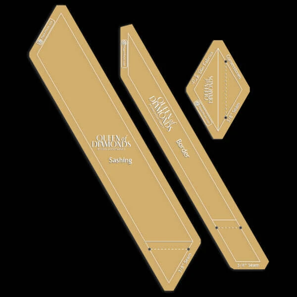 Dieses Set ermöglicht Ihnen das Fussy Cutting der Corner Stones & Lattices. Die Acrylschablonen entsprechen den Größen für die Sashing Streifen, also das Gitter zwischen den Diamonds des Tula Pink Queen of Diamonds Projektes, sowie den Rauten in den Schnittpunkten dieser. Hiermit wird der Rollschneiderzuschnitt und Motivschnitt vereinfacht.