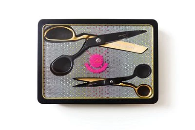 Scharfes und präzises Set aus einer großer 8 Zoll Schneiderschere und geraden 6 Zoll Stoffschere. Diese Designer-Scheren-Kollektion wurde in limitierter Auflage passend zur Linework-Stoffkollektion von Tula Pink entwickelt. Aufgrund der Pandemie hat sich der Lieferstart um ein ganzes Jahr verschoben! :-O Es wird diese Scherenset nur solange der Vorrat reicht als einmalige Auflage geben. Der besondere Clou der schwarz-goldenen Designerscheren? Eine spezielle – Fabrics Only -Gravur auf der Klinge der Schere erinnert an den Einsatzzweck und warnt vor Missbrauch. 😉