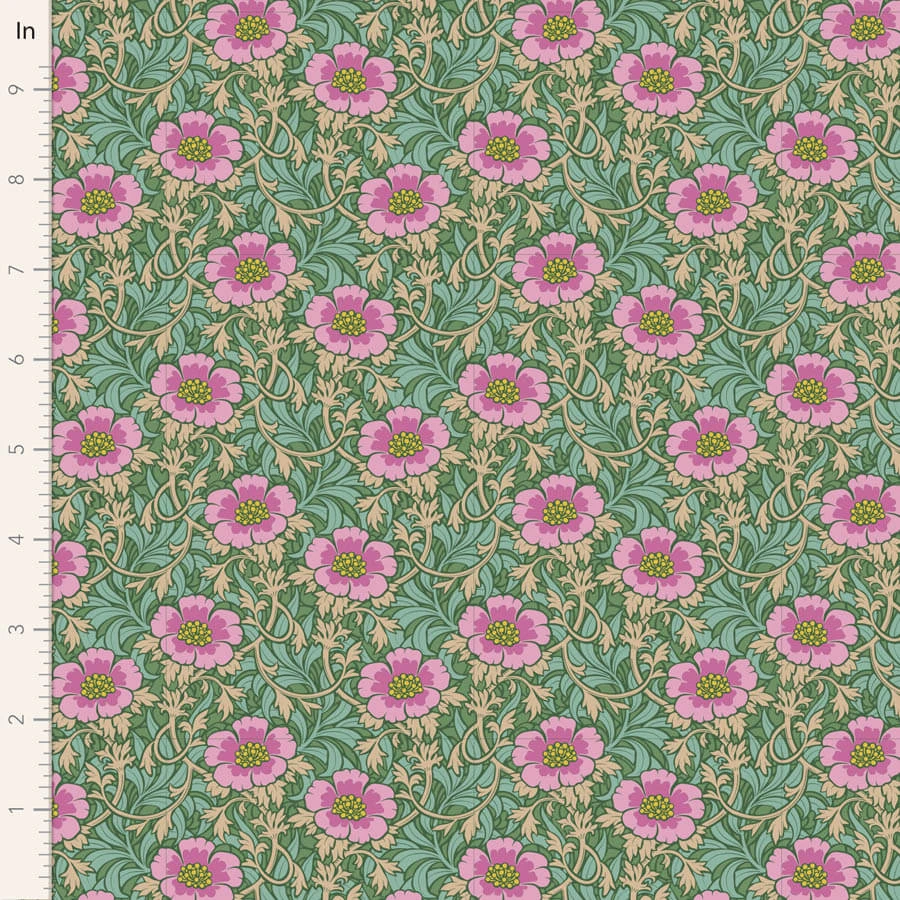 Die Designs sind von der Arts-and-Crafts-Bewegung inspiriert, mit helleren Elementen auf dunklem Hintergrund und einem Lagen-Look, perfekt für Herbst- und Winterprojekte. Staubige Farben wie Nussbraun, Hibiskusrot, Blau und Salbei verleihen der Kollektion einen zeitlosen Vintage-Look.