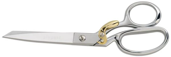 8 inch (20,32 cm) silberne Standard Schneiderschere Knife Edge Sewing Scissors aus dem Hause Gingher – der Rolls Royce unter den Scheren – mit Spring Action, einem Federsystem welches das Öffnen und Schließen der Schere erleichtert fast ohne Kraftaufwand z.B. für Arthritis-Geplagte. Der goldene Riegel hält die Schere sicher zusammen, wenn diese nicht in Gebrauch ist und sichert diese vor dem automatischen Aufspringen.