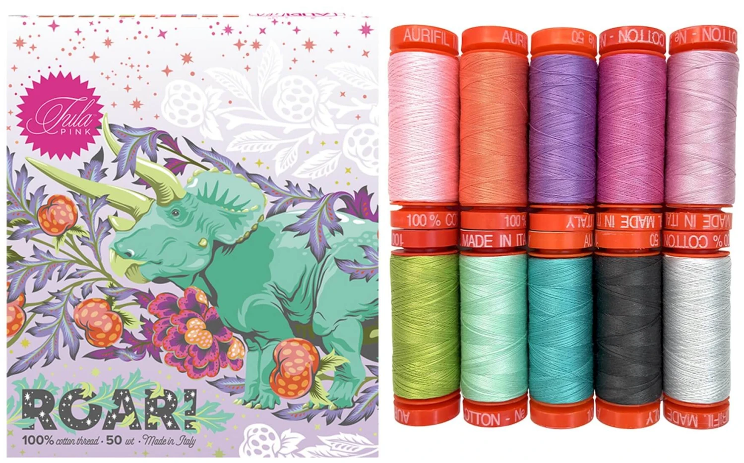 Zehn kleine Spulen Aurifil 50wt-Garn unterstreichen perfekt die Farben der neuen Free Spirit Stoffserie.“Roar“ von Stardesgnerin Tula Pink!