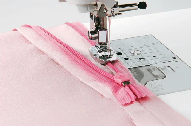 - Reißverschlussfuß anschrauben und Geradestich auswählen.